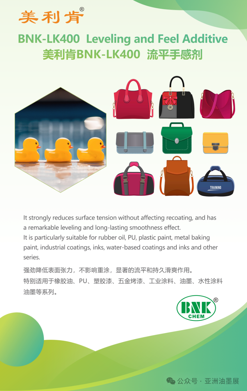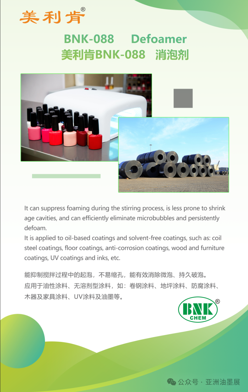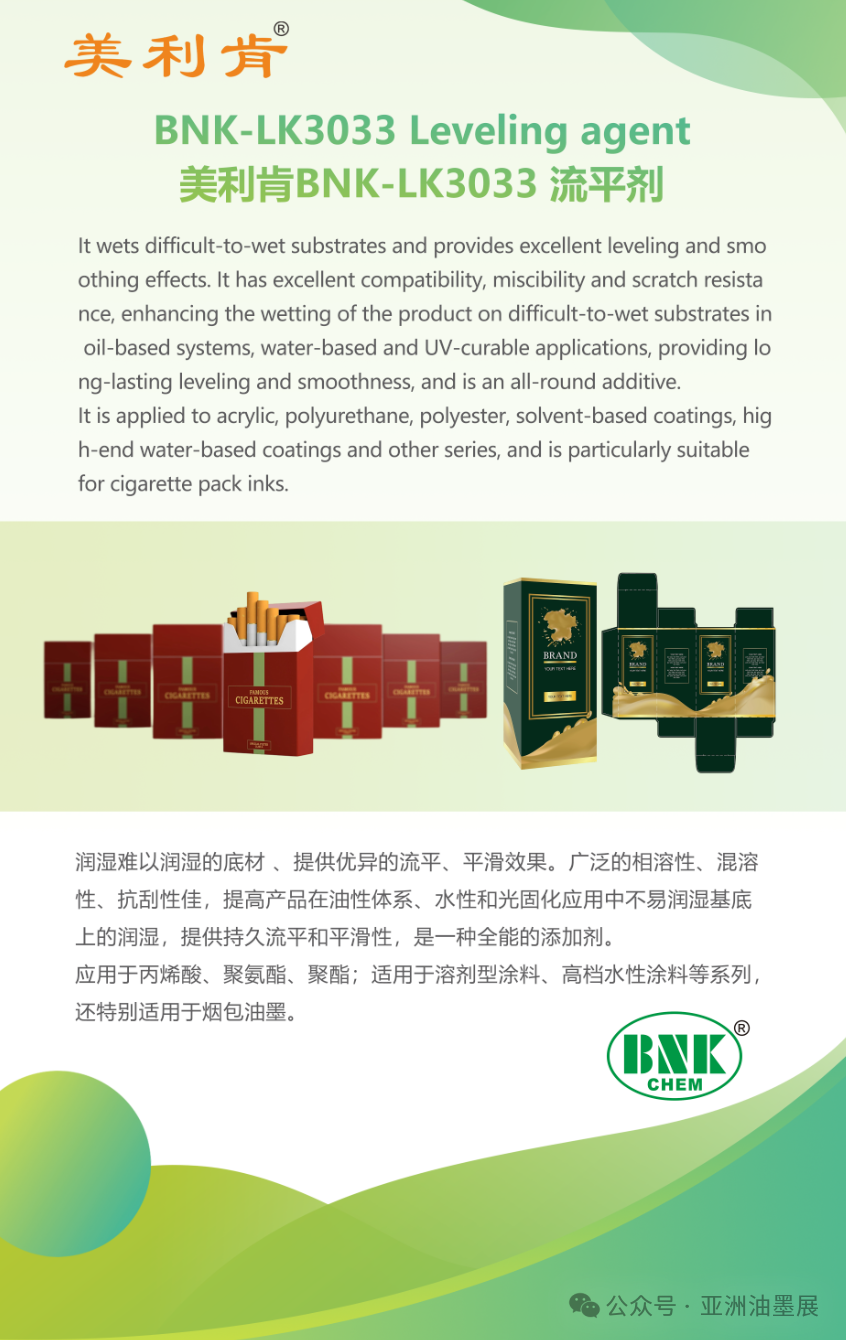 UV(紫外光固化)油墨:BNK-LK400流平剂、BNK-LK3033流平剂、BNK-M3550流平剂、BNK-NSF398消泡剂、BNK-088消泡剂;