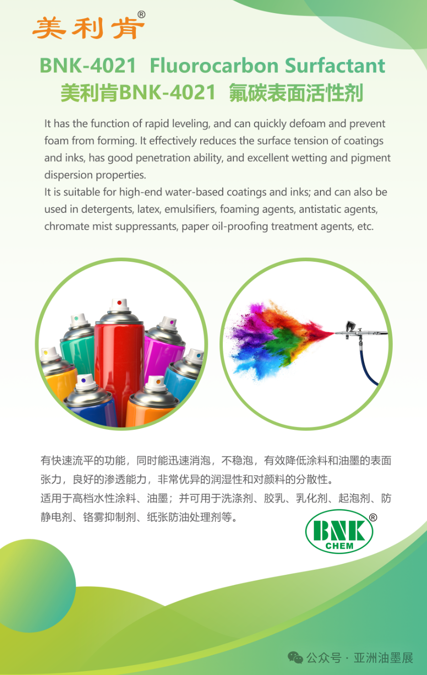 水性油墨:BNK-4021氟碳表面活性剂、BNK-4036氟硅表面活性剂、BNK-G408消泡剂、BNK-G409消泡剂;