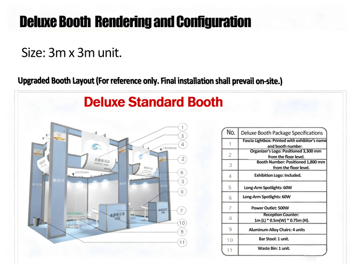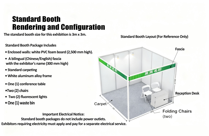 1. 3m*3m(Three-sided partition panels, 2.5 meters high) 2. Equipped with one negotiation table, two folding chairs, two fluorescent lamps, bilingual nameplates (in Chinese and English), a trash bin, and carpet 3. An additional 10% charge for double-sided openings