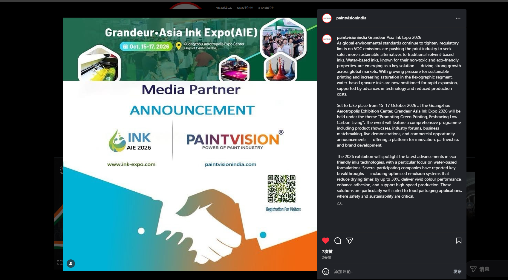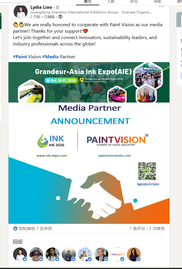 Paint Vision作为印度专注于涂料、涂层及附属行业的综合营销与品牌服务商,凭借其深厚的行业资源、AI驱动的数字营销解决方案以及多渠道媒体覆盖,已成为该领域内极具影响力的专业平台。通过此次合作,Paint Vision将通过其旗下平台《Industrial Front》报纸、WhatsApp精准推送、网站横幅、社交媒体运营及AI客服等一体化服务,以线上线下整合传播、专业观众邀请等形式,助力展会实现更精准的宣传覆盖与参展商互动,为2026亚洲油墨展带来更广泛的行业曝光、高质量的B2B观众群体以及创新的内容传播方式。