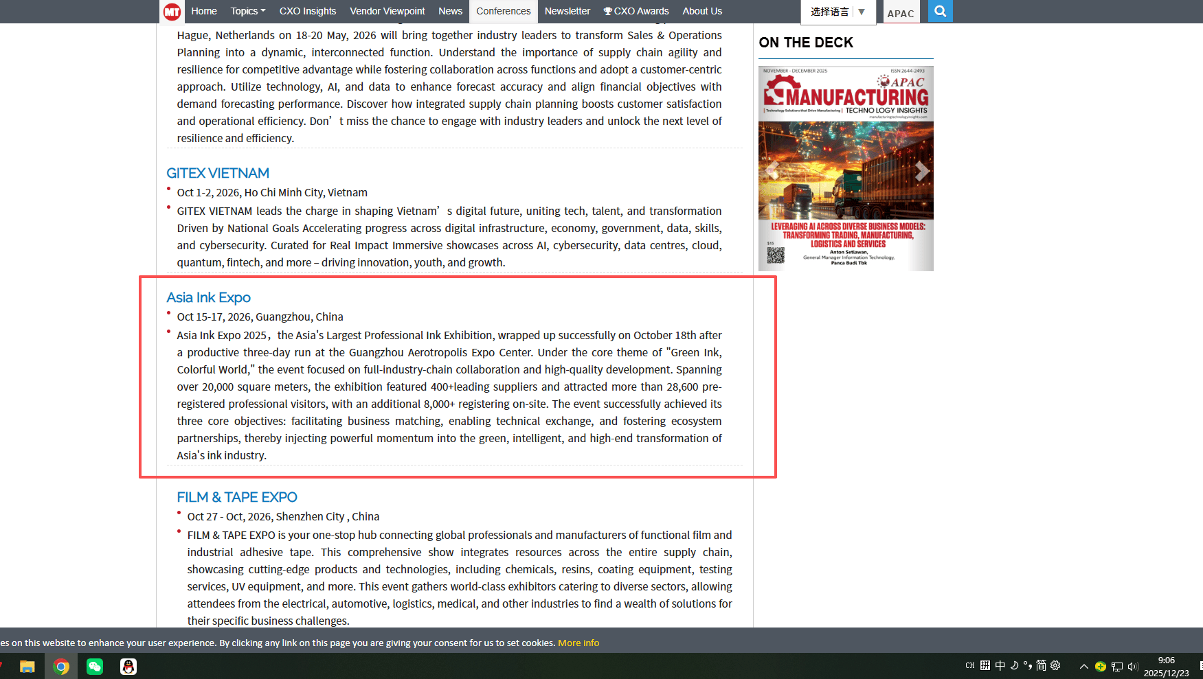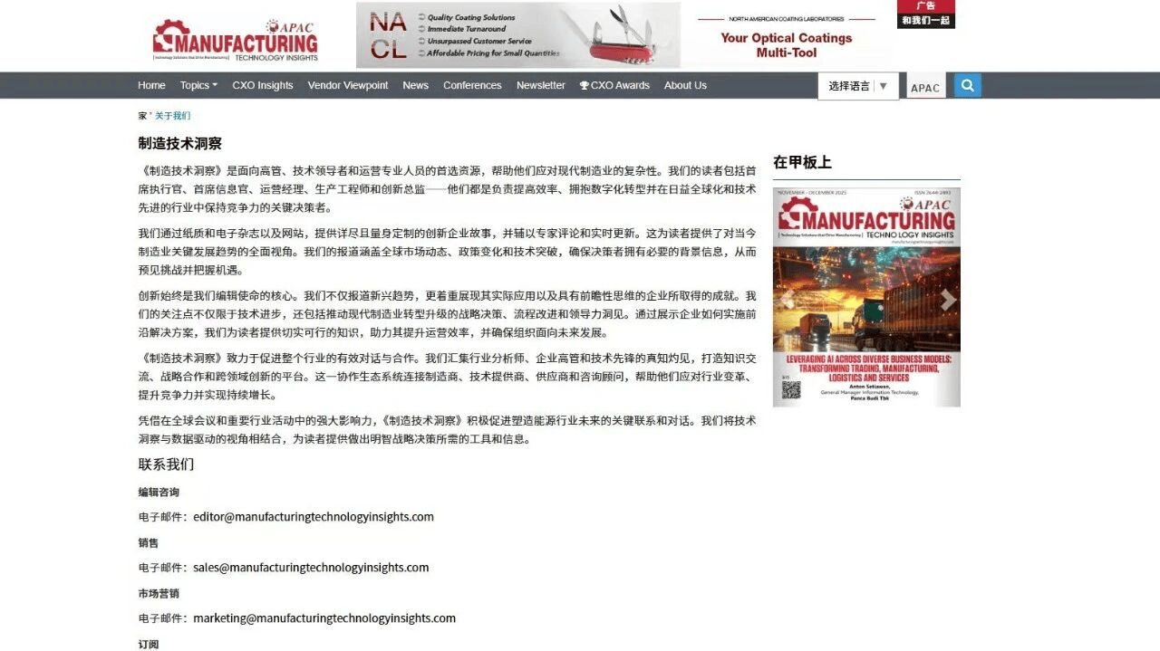 亚洲油墨展再获国际权威媒体关注,全球知名行业杂志《Manufacturing Technology Insights》专题报道。